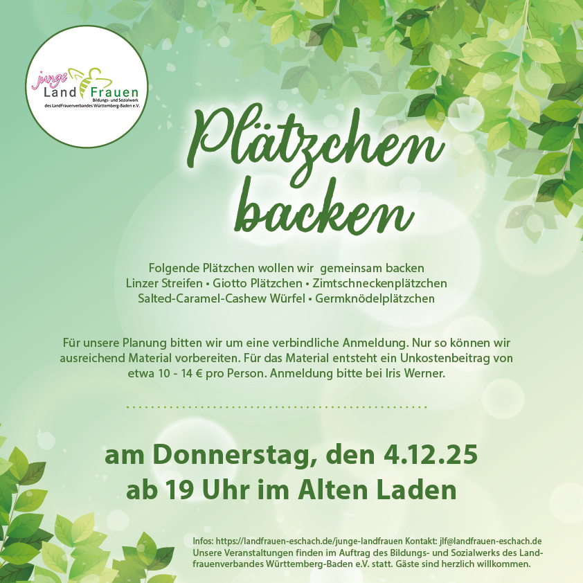 Linzer Streifen, Giotto Plätzchen, Zimtschneckenplätzchen, Salted-Caramel-Cashew Würfel, Germknödelplätzchen, die Unkosten werden zwischen 10 und 14€ pro Person liegen. Wir bitten um verbindliche Anmeldung, so können wir besser planen und sicherstellen, dass für alle genügend Material vorhanden ist. Anmeldung bitte bei Iris Werner.