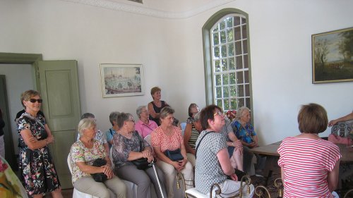 Die Kutschen fuhren früher bis zur Eingangstreppe. Aufwendige Gemälde schmücken die hellen Decken und Wände des freiaufliegenden, berühmten, großzügigen Treppenhauses. Im Rittersaal tranken die Frauen an sommerlich gedeckten Tischen Kaffee und ließen sich den Kuchen schmecken. Zahlreiche Porträts der adelmannschen Familie schmücken den Rittersaal und in vielen Vitrinen im Porzellanzimmer gab es Dinge aus vergangenen Tagen zu sehen. Einer der ältesten Heckengärten Europas war das nächste Ziel. Leider hatte er durch die anhaltende Trockenheit etwas an Schönheit eingebüßt. Das Lustschloss am Ende des Parks, ist klein, aber fein. Verziert mit Wandmalereien und einem Kuppelfresko bietet es einen schönen Rahmen für regelmäßig stattfindende Trauungen.