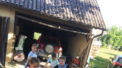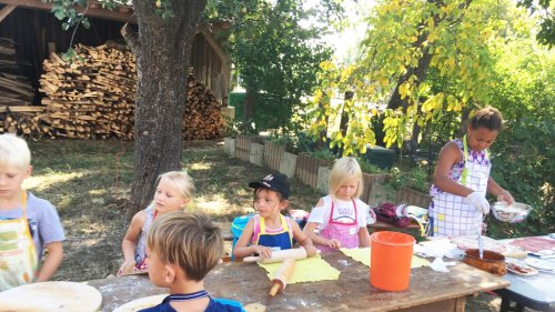 Siebzehn Mädchen und Buben waren gekommen um einmal Pizza von A bis Z selbst zu machen und nicht wie üblich die Kurzfassung zu erleben; Raus aus dem Tiefkühlfach, rein in den Ofen - fertig. Sie erfuhren den Zeitaufwand, den es für eine gute Pizza braucht, angefangen von der Teigherstellung über das Auswellen, das Belegen und Backen. Margit Stieglitz und ihre Enkelin Vanessa hatten die Zutaten vorbereitet und die Kinder belegten die Teigfladen nach ihren Wünschen. Im Elektrobackofen beobachteten sie wie der Hefeteig Blasen bildete, eine Kruste bekam und der Belag unter der Hitze langsam verschmolz. Zusätzlich sorgten Ilse Kiesling, Elfriede Ladenburger und Vorsitzende Annemarie Werner für das Wohl der Kinder, die es sich nach getaner Arbeit im Schatten des Hofbaumes gemütlich machen durften.