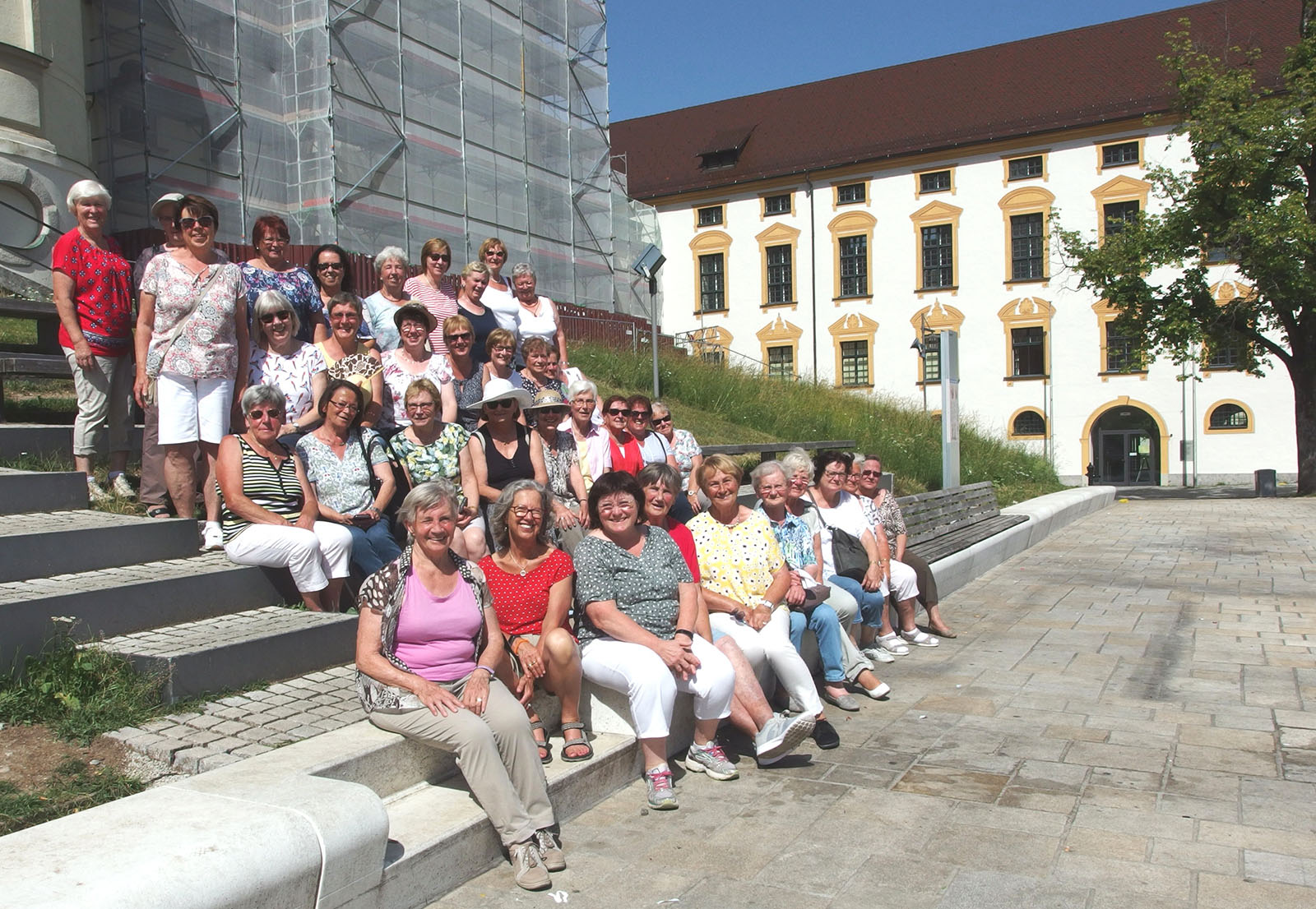 Beim anschließenden Stadtrundgang war an diesem heißen Tag der "Kemptener Schatten" ganz besonders gefragt. Große Gebäude werfen viel Schatten und große Gebäude gibt es in Kempten zur Genüge. Da wäre zum einen die prunkvolle Residenz, zum anderen die dominierende katholische Basilika St. Lorenz, die Orangerie oder die evangelische St. Mangkirche. Bei Grabungen auf deren Vorplatz wurden Schädel und Gebeine entdeckt, die auf eine frühere Friedhofsanlage schließen lassen. Akribisch aufbewahrt werden diese Relikte in der unterirdischen Erasmuskapelle, die nicht nur wegen ihrer Kühle gerne aufgesucht wurde sondern auch wegen einer hochmodernen Videoschau, welche die Frauen tief in die Vergangenheit eintauchen ließ. Spannende Stadtgeschichte vermittelten auch die Gästeführer als sie bei ihren interaktiven Erzählungen an die rohen Sitten und Gebräuche in der einst rivalisierenden Doppelstadt erinnerten, erst im Jahr 1818 wurden Reichs- und Stiftsstadt zur Stadt Kempten vereinigt. Sehr angenehm war eine Rundfahrt im Bus durch die grüne Umgebung der 70.000 Einwohner-Stadt wobei man feststellen konnte, dass diese sich, vor dem Hintergrund der Alpen, regelrecht in das Tal der Iller duckt. Genügend Zeit zur freien Verfügung ermöglichte der Gruppe einen Stadtbummel durch klimatisierte Kaufhäuser oder kühle Gärten mit Brunnenanlagen.
