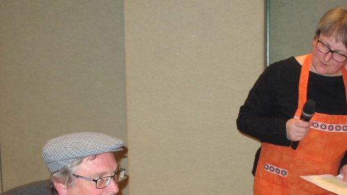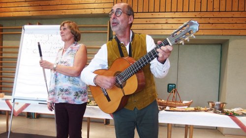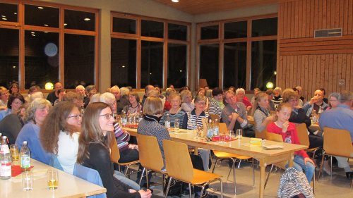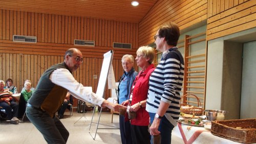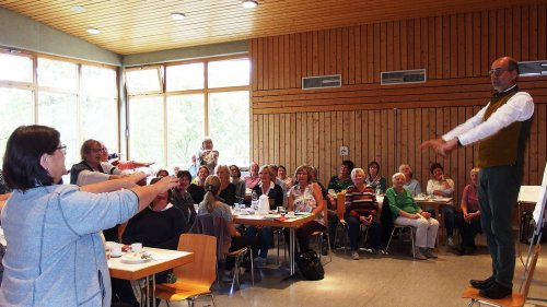 Seine Pointen sitzen, schon eine Handbewegung, ein Kopfschütteln oder Augenzwinkern im richtigen Moment kann wahre Lachsalven auslösen. Bernhard Bitterwolf ist nicht nur Dozent an der Bauernschule Bad Waldsee, sondern er versteht sein Handwerk auch als Musiker, als Schwäbischkenner oder Conférencier. Obwohl kein Mediziner gab er Tipps zur "Xondheit", wie das richtige "Schnaufen", das richtige Essen, oder die richtige Bewegung. Immer band er die Landfrauen in seine Vorstellungen mit ein. So bei einem Liederrätsel oder bei Lobliedern auf den Leberkäse, beziehungsweise den Kartoffelsalat, die genüsslich mit Mm's und Aa's untermalt wurden. Bitterwolf ist ein Mann der fröhlich macht und dem die Gemeinsamkeit ebenso wichtig ist wie das Singen; "Wenn man mit 90 Jahren noch singt, kann man mit 80 Jahren noch nicht gestorben sein", forderte er zum Mitsingen auf. Seinen Segensspruch, den er mit auf den Weg gab lautete;+56 "Bleibt xond ond g'fräs", ein Spruch, der in harten Zeiten entstanden sei, der aber auch zum opulenten Frühstück passe. Die Eschacher Landfrauen verabschiedeten den Referenten begeistert mit stehendem Applaus.