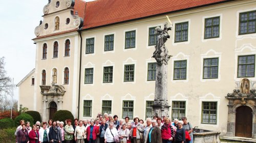 Bei der Wallfahrtskirche St. Martin in Mönchsdeggingen gab es einen Halt um das prächtige Gotteshaus von innen zu betrachten. "Die "Wies im Ries" wird die ehemalige Klosterkirche genannt, mit einer großen Klosteranlage, die einst Benediktinermönche und später die Mariannhiller Missionare beherbergte. Seit fünf Jahren gibt es kein Leben mehr hinter den ehrwürdigen Mauern, Seminarräume und Wirtschaftsgebäude sind verwaist. Die Gästeführerin berichtete jedoch von einem Augsburger Gastwirt, der die Klosteranlage zur Nachnutzung gekauft habe. Weiter ging es durch die typischen Straßendörfer, man betrachtete Schloss Harburg, die ehemals staufische Reichsburg und beinahe hätten die Landfrauen Fürst Moritz zu Oettingen-Wallerstein einen Besuch in Schloss Hohenaltheim abgestattet, allerdings zeigte die nicht vorhandene Fahne an der Turmspitze an, dass das Familienoberhaupt nicht am Stammsitz weilte.