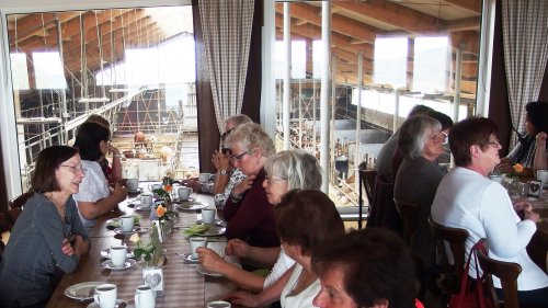 Man wendete sich alltäglicheren Dingen und damit der Kaffeepause zu. "Wir werden in einem Q-Cafè einkehren", hatte Vorsitzende Annemarie Werner angekündigt. Dieses Ziel wurde mit Spannung erwartet. Vorbei an Burg Katzenstein und mit Blick auf den Härtsfeldsee fuhr der Bus in Frickingen vor, auf einem großen landwirtschaftlichen Betrieb, den die Familie Raunecker als Teilaussiedlung im Jahr 2014 erstellte. Die Landfrauen hatten Glück und erlebten die zweite von drei Melkzeiten in einem Melkstand in dem 48 Kühe gleichzeitig gemolken werden können. Dreihundert Kühe werden derzeit in etwas mehr als zwei Stunden gemolken und das dreimal am Tag, machte der Seniorchef klar und erzählte, dass es der Wunsch seiner beiden Söhne war, den Betrieb weiterzuführen. Die Eschacher Landfrauen gelangten ins Q-Cafè, von dem aus durch große Glasscheiben der gesamte Kuhbetrieb überblickt werden konnte. Fasziniert vom scheinbar reibungslosen Ablauf im Stall gab es genügend Fragen, denen sich Herr Raunecker gerne stellte. Währenddessen bediente seine Ehefrau die Gäste mit Kaffee und selbst gebackenen Torten und Kuchen.