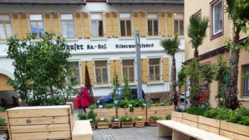 Ob im "Garten der Stille" bei der Peter und Paul Kirche, ob im "Hildegard-von-Bingen-Garten", beim Weidentunnel am Mühlbach, im Duftrosengarten, an der "Baumschule" oder in der Remsaue, überall staunten die Besucherinnen über das Zusammenspiel von kreativen Ideen und deren künstlerische, gärtnerische oder handwerkliche Umsetzung. Es wäre noch viel mehr Zeit zu verbringen gewesen, aber das Wasser spielte eben eine Hauptrolle, im speziellen das Wasser das von oben kam. So wurden die Stühle im "Gartenschau-Cafè" schnell besetzt und bei selbst gebackenen Kuchen und Kaffee richtete sich der Blick auf den "Meraner Himmel", der an dünnen Drähten über dem Mögglinger Marktplatz schwebt. Als Gästeführerin Claudia Vogt vom schwierigen Aufbau des Gebildes berichtete, hatte keine der Frauen Zweifel an der mühevollen Arbeit, die nun so leicht und filigran wirkt. Beeindruckt waren die Frauen auch vom gemütlichen Bummel durch den Ort, der vor dem Bau der Ortsumgehung niemals denkbar gewesen wäre.