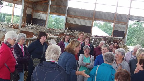Im Laufe des Nachmittags gab die lebenskluge Frau aber noch mehr von sich preis. Doch zunächst durften die Landfrauen bei Kaffee und Kuchen in der Lindenhofstube Platz nehmen. Wer wollte konnte bei der anschließenden Melkzeit durch große Fenster von oben auf das Melkkarusell blicken, wo sich prächtige Fleckviehkühe in aller Gemütsruhe einstellten um von Jungbauer Daniel und seinem Helfer gemolken zu werden. 32 Kühe haben darin auf einmal Platz und nach anderthalb Stunden waren alle Kühe gemolken. Während manche Frauen sich in die Mitte des Melkkarussels begaben um näher am Melkprozess zu sein, begleitete eine andere Gruppe Klaus Mayer und sein Milchtaxi mit dem er rund fünfzig Kälber versorgt.