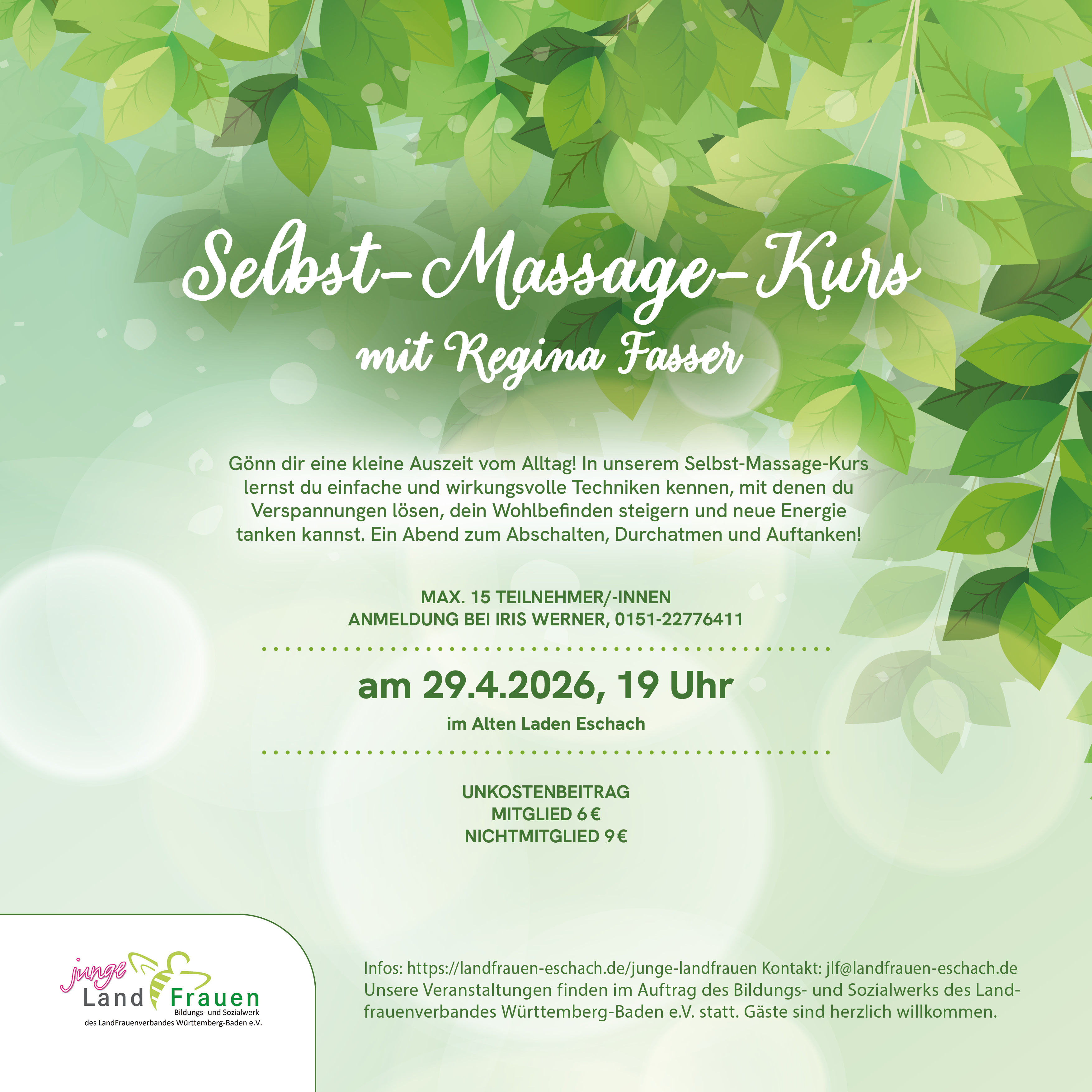 Gönn dir eine kleine Auszeit vom Alltag! In unserem Selbst-Massage-Kurs lernst du einfache und wirkungsvolle Techniken kennen, mit denen du Verspannungen lösen, dein Wohlbefinden steigern und neue Energie tanken kannst. Ein Abend zum Abschalten, Durchatmen und Auftanken!