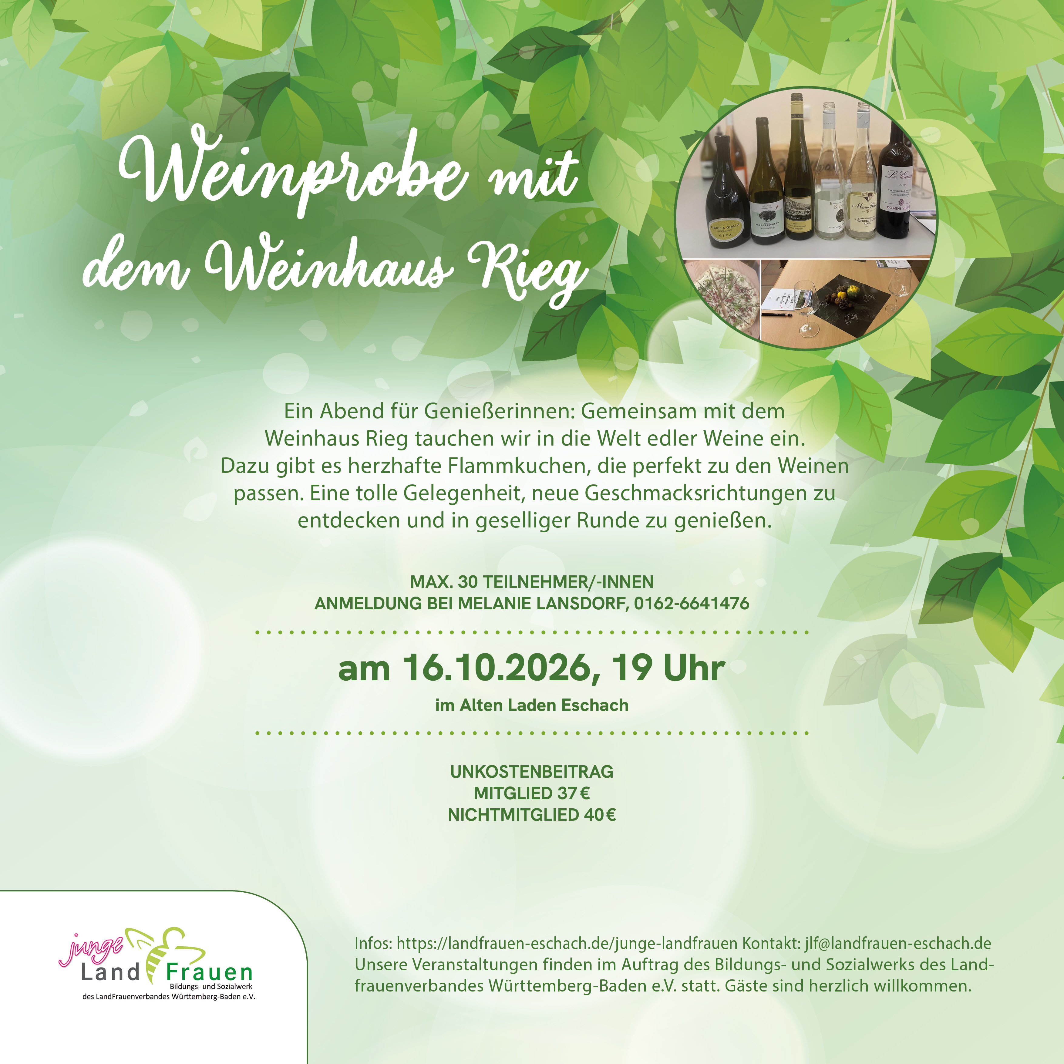 Ein Abend für Genießerinnen: Gemeinsam mit dem Weinhaus Rieg tauchen wir in die Welt edler Weine ein. Dazu gibt es herzhafte Flammkuchen, die perfekt zu den Weinen passen. Eine tolle Gelegenheit, neue Geschmacksrichtungen zu entdecken und in geselliger Runde zu genießen.