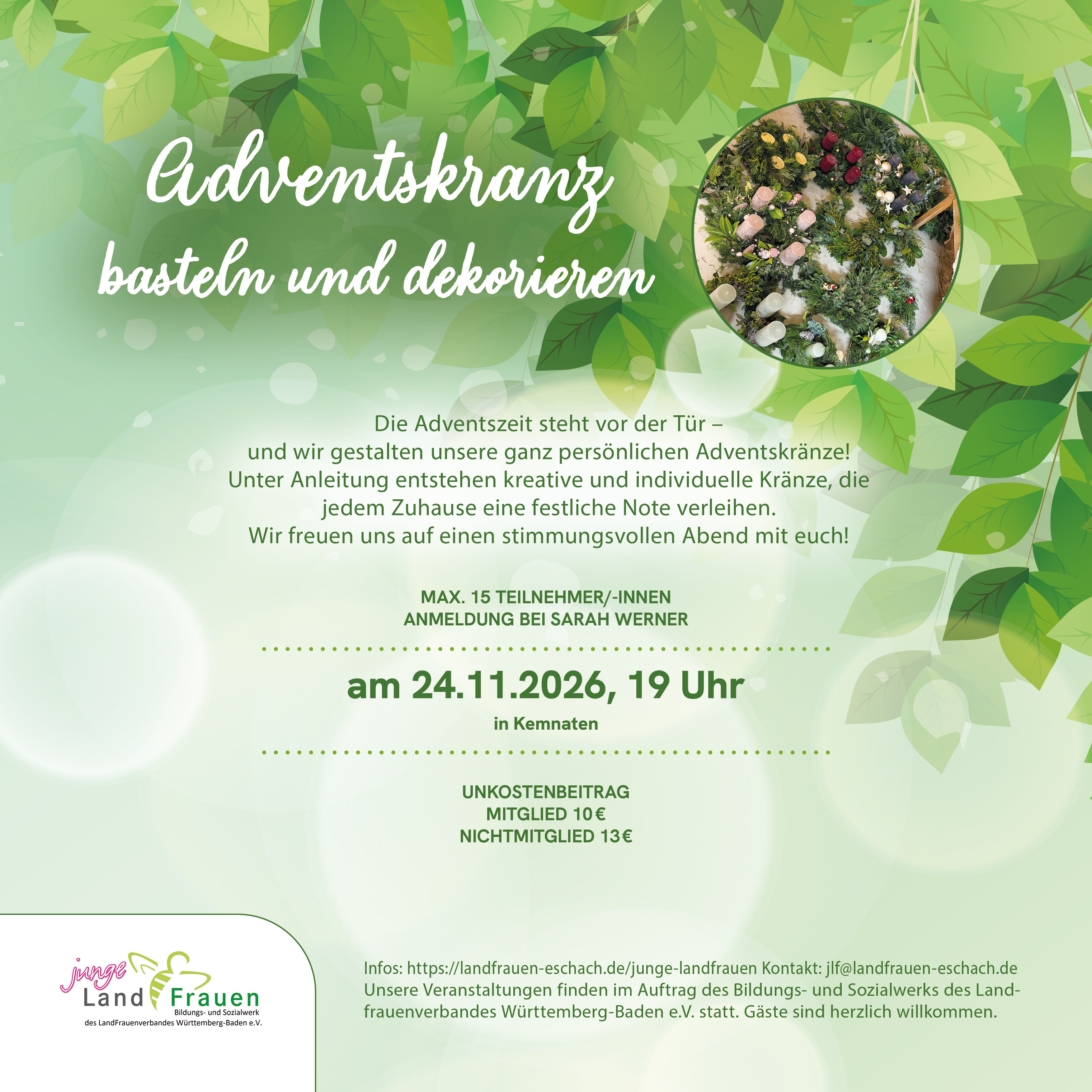 Die Adventszeit steht vor der Tür – und wir gestalten unsere ganz persönlichen Adventskränze! Unter Anleitung entstehen kreative und individuelle Kränze, die jedem Zuhause eine festliche Note verleihen. Wir freuen uns auf einen stimmungsvollen Abend mit euch!
