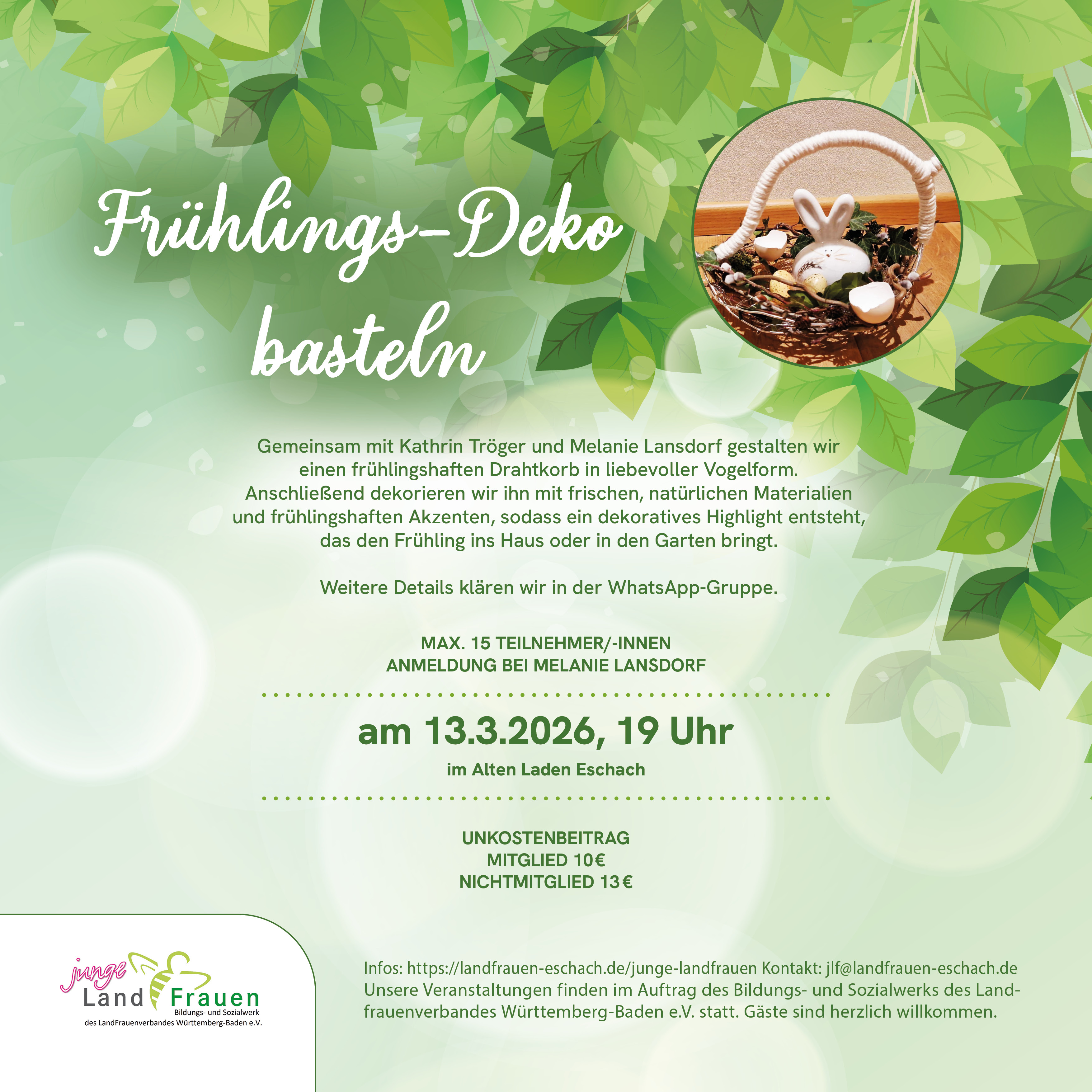 Gemeinsam mit Kathrin Tröger und Melanie Lansdorf gestalten wir einen frühlingshaften Drahtkorb in liebevoller Vogelform. Anschließend dekorieren wir ihn mit frischen, natürlichen Materialien und frühlingshaften Akzenten, sodass ein dekoratives Highlight entsteht, das den Frühling ins Haus oder in den Garten bringt.